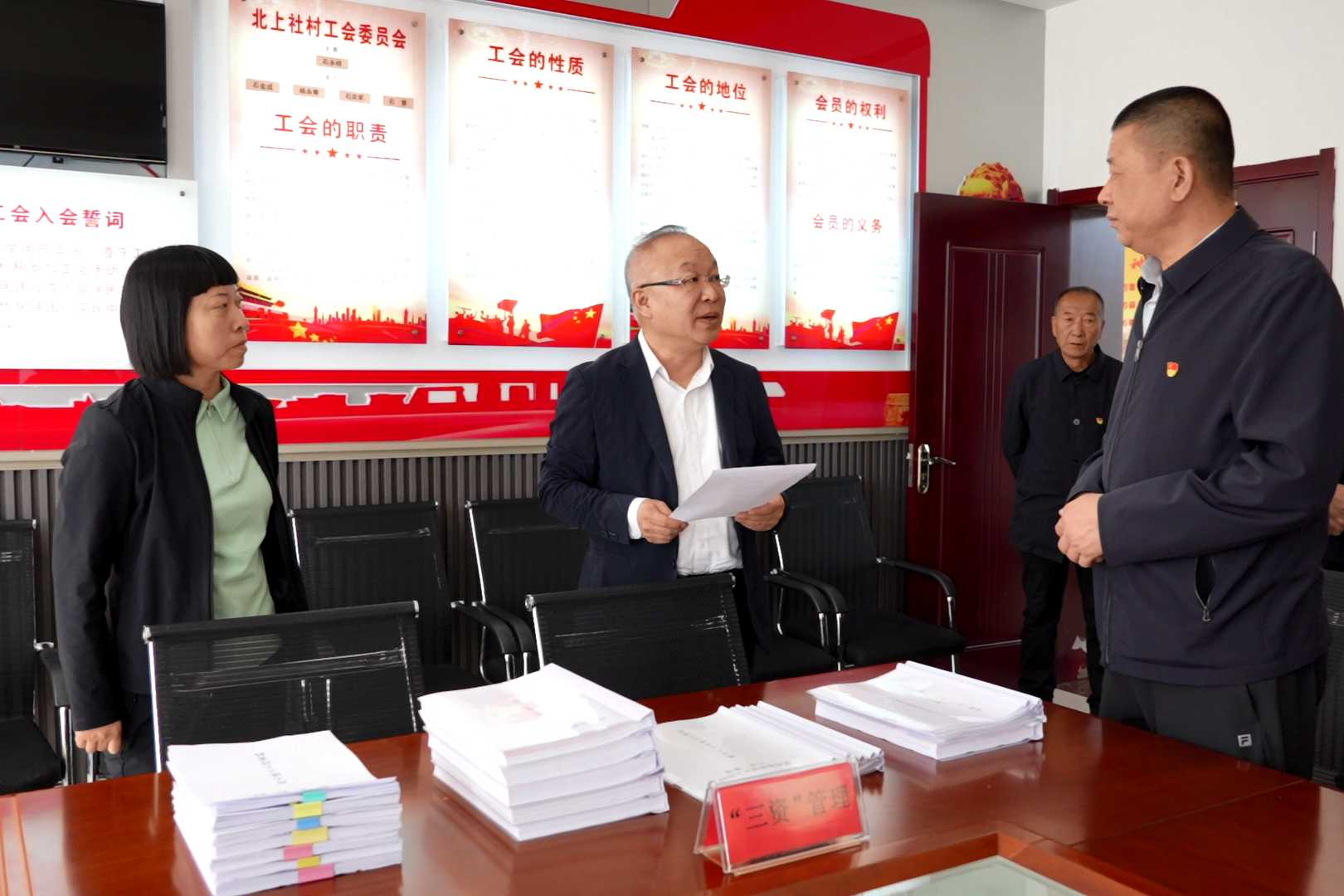 暮春时节的南娄镇北上社村村容整洁、生机盎然。王拥国一行走进村委会,与镇村干部、相关负责人座谈交流,详细听取该村“三资”管理工作汇报,重点询问当前存在的短板弱项与堵点难点。近年来,北上社村以党建为引领,抓实基层组织建设,稳步推进土地延包、道路沿线环境整治、光伏停车场建设等重点工作,依托“三个一批重点村”监督治理,夯实基层治理基础,为规范“三资”管理筑牢根基。