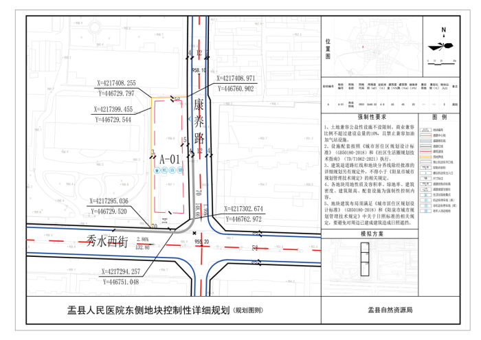 控规片区位于中心城区城镇开发边界范围内,南侧临城市生活性主干道秀水西街,西侧紧邻盂县人民医院,北侧为盂县人民医院在建医技楼二期,东侧为现状居民区(高层住宅楼和低层平房)。